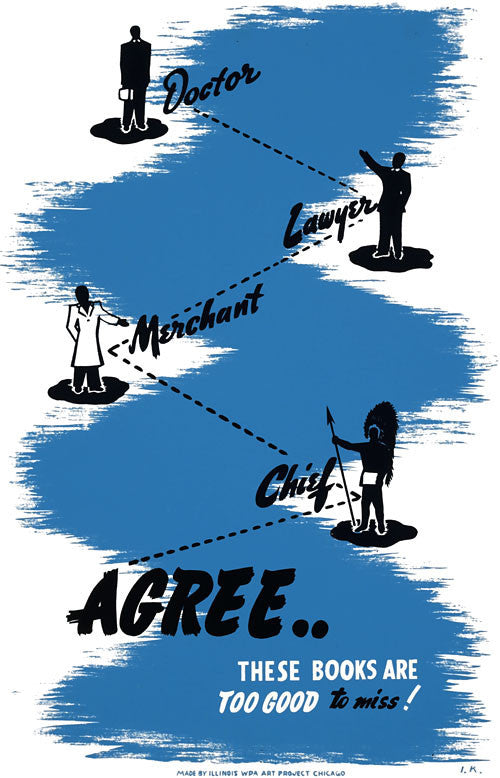 This poster was created in Chicago for the Illinois WPA Art Project, circa 1940, to promote reading. It shows a doctor, a lawyer, a merchant and a Native American in headdress and reads: 'Doctor, lawyer, merchant, chief agree . . . these books are too good to miss!'