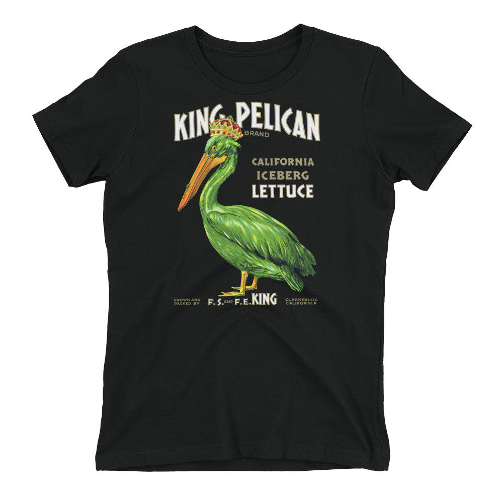 The t-shirt design is from the King Pelican Iceberg Lettuce crate label. "Grown and packed by F.S. and F.E. King Clarksburg California." From the 1900s to 1950s fruit crate labels were used to market and differentiate fruit packer brands at farmer markets.