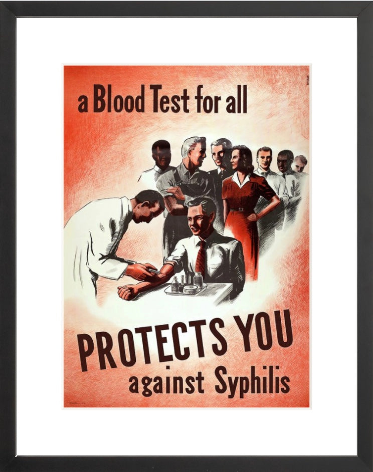 Paper: White borders. Premium matte, 200 gsm (80 lb). Image dimensions may not match paper. Printed image sizes below for A Blood Test for All Protects You Against Syphilis.• 11"x17" paper has .5" border = 10"x13.9" image