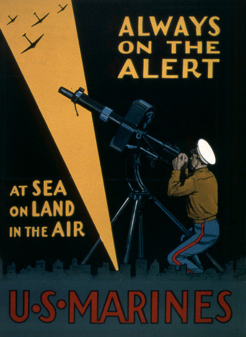 Always on the alert. At sea. On land. In the air. U.S. Marines. Vintage WWII poster. Recruiting poster published by the United States Office of War Information, 1945.