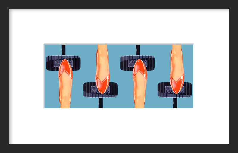 American Brake Shoe. Vintage 1956 graphic illustration. A four-pack of woman's red pumps on the brake.