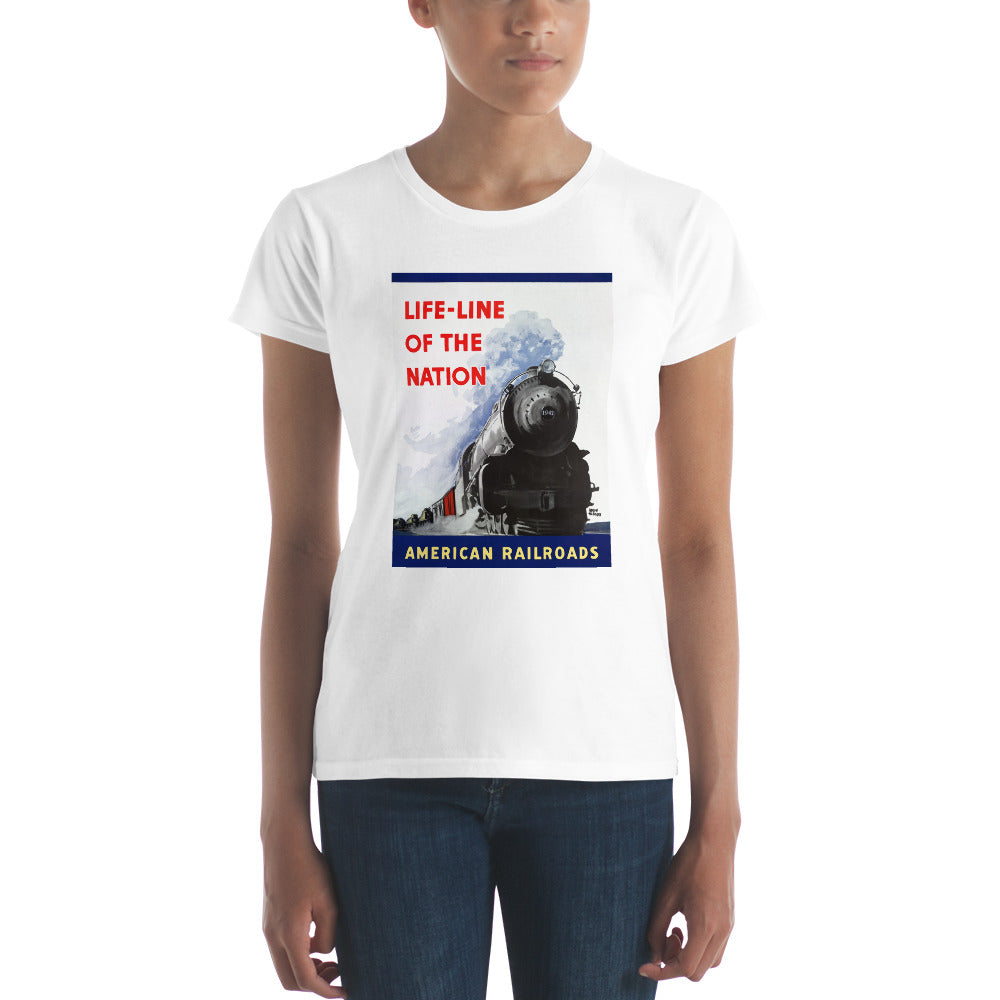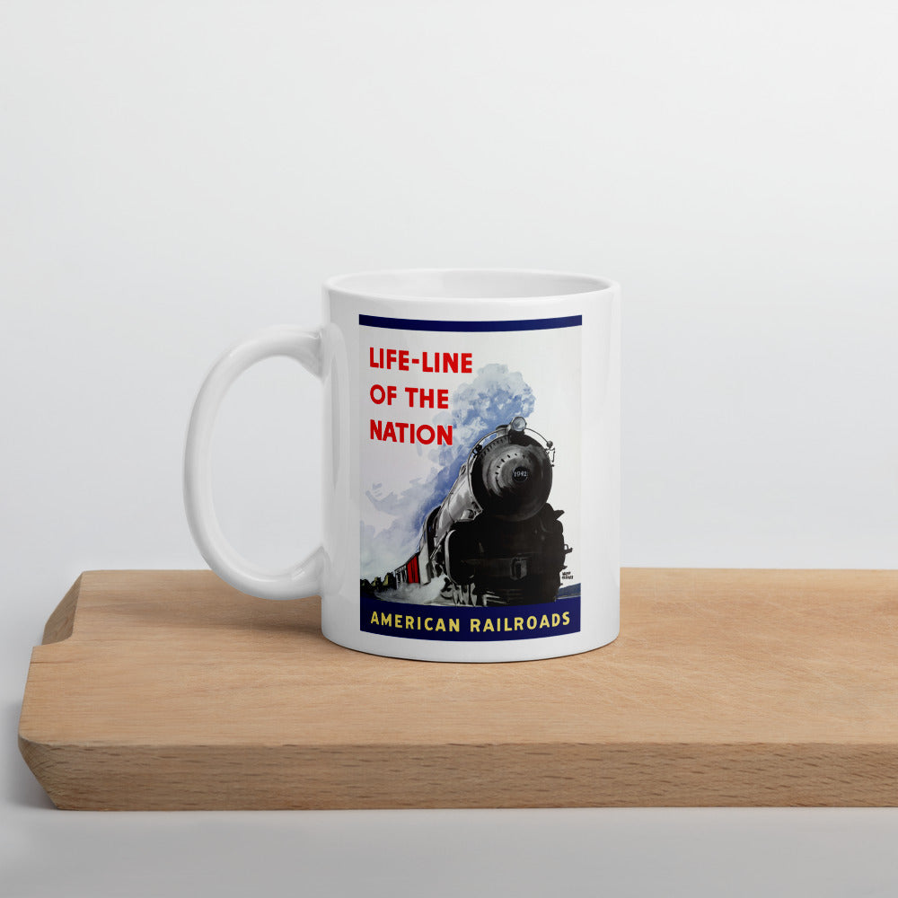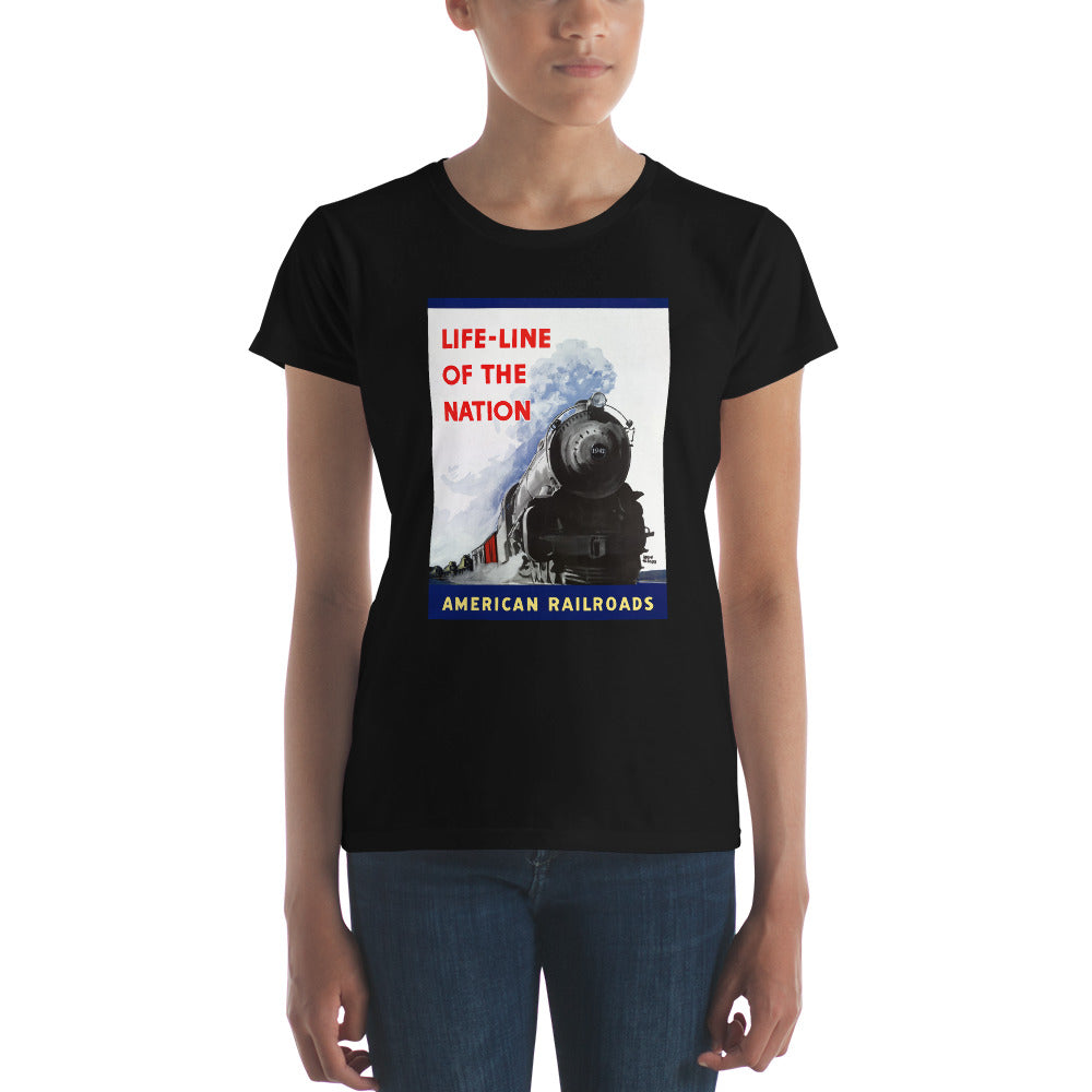 American Railroads: Life-Line of the Nation. Vintage WWII poster showing a steam engine pulling a train loaded with military tanks. Illustrated by Adolph Treidler, 1942.