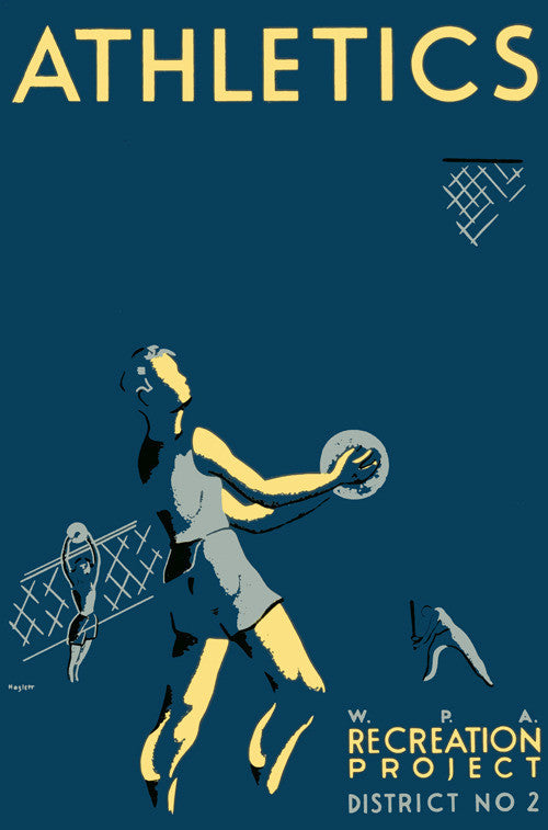 This 1939 poster from the WPA Federal Art Project in Chicago shows young athletes playing playing basketball, baseball, and volleyball.