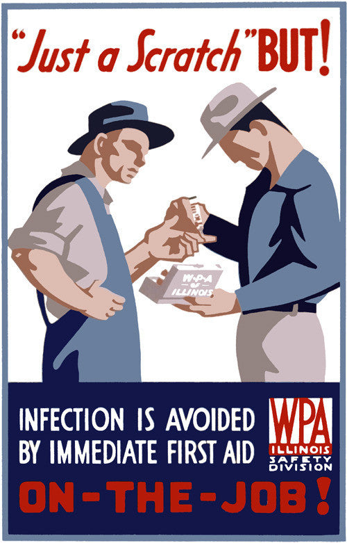 This poster for the WPA Illinois Safety Division encourages immediate first aid for on-the-job injuries: ''Just a scratch' But! Infection is avoided by immediate first aid on-the-job!' The poster was created as part of the WPA Federal Art Project between 1936 and 1941.
