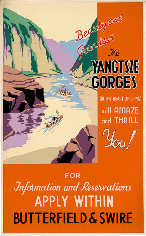 Beauty and Grandeur. The Yangtsze (i.e., Yangtze) Gorges (in the heart of China) will amaze and thrill you! For information and reservations apply within. Butterfield & Swire. This vintage travel poster shows tourist boats in the gorges of the Yangtze River in China, circa 1934.