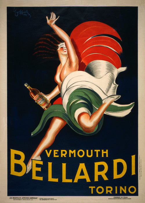 Bellardi Vermouth Torino. Illustrated by Leonetto Cappiello, 1927. A vintage Italian advertisement for Bellardi Vermouth. A woman dances while holding a bottle of Bellardi Vermouth.