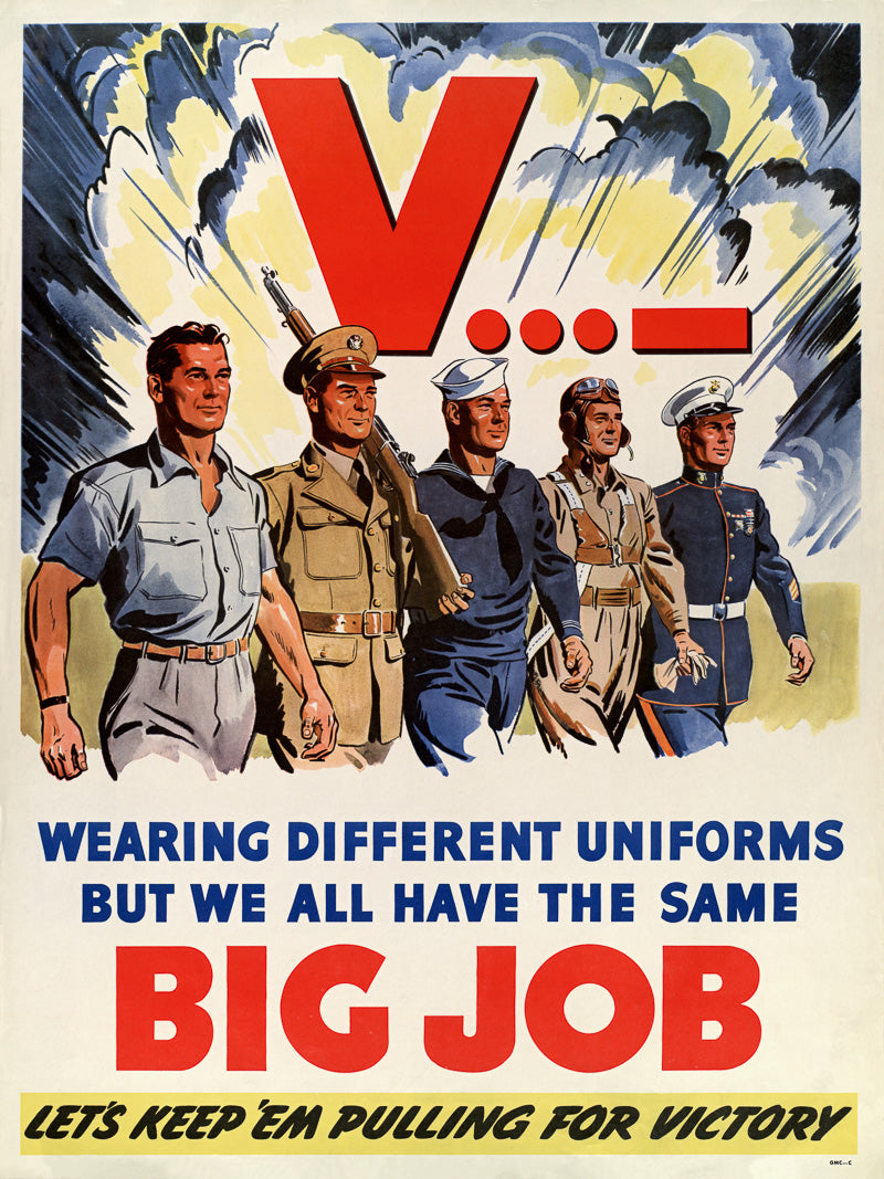 V... Wearing Different Uniforms But We All Have the Same Big Job. Let's Keep 'em Pulling for Victory. Men in the uniforms of the different branches of the United States military stand alongside a factory worker. WWII era industrial mobilization poster.