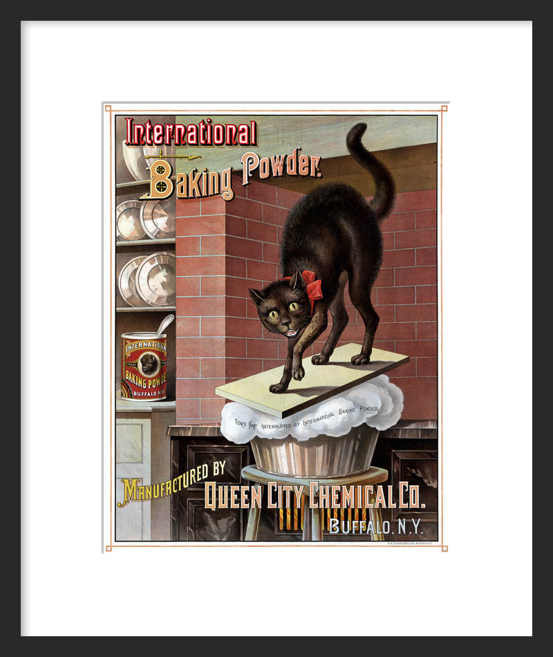 International Baking Powder. Vintage advertisement for International Baking Powder. A black cat is disturbed while napping on rising dough. Text reads: "International Baking Powder. Tom's nap interrupted by International Baking Powder. Manufactured by Queen City Chemical Co. Buffalo, N.Y." Circa 1885.