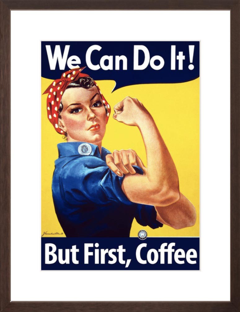 This But First, Coffee poster is a whimsical take on the iconic Rosie the Riveter poster from WWII. Share your love for coffee in this beautifully restored poster.