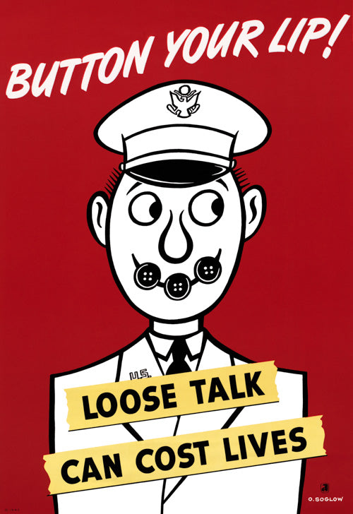 Button Your Lip! Loose Talk Can Cost Lives. Providing a WWII wartime reminder about the vigilance needed to fight espionage. Illustrated by Otto Soglow, 1942.