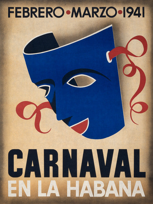 Carnaval en la Habana. Febrero - Marzo, 1941. Cuban vintage travel poster showing a carnival mask, 1941. Havana, Cuba carnaval promotion. Artes Graficas, S.A.
