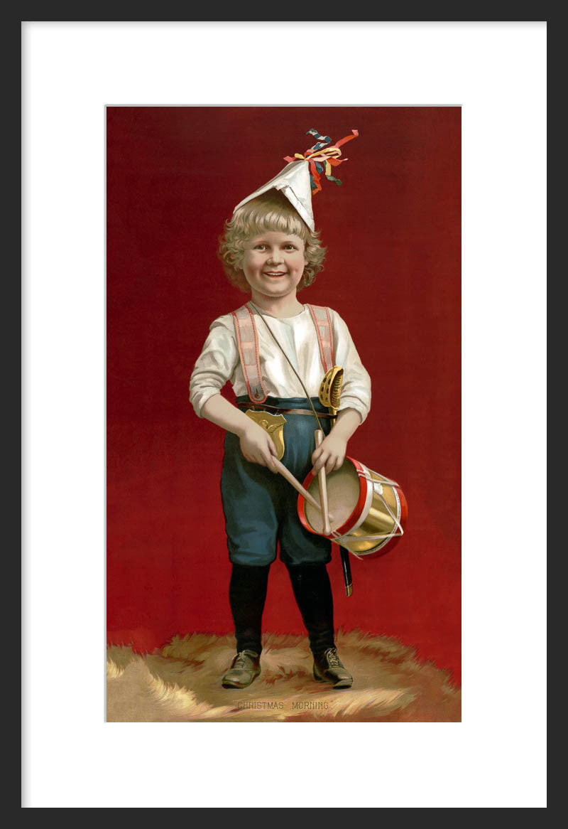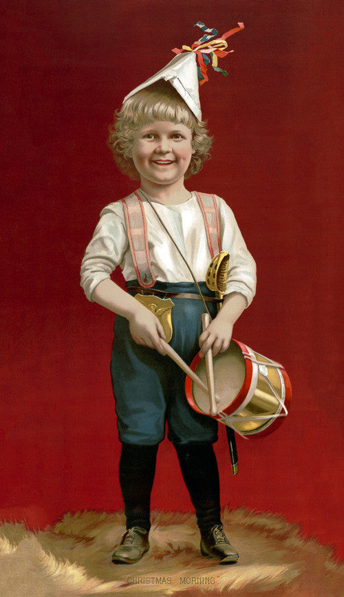 Christmas morning drummer boy. Vintage Christmas image of a boy dressed up as a drummer, circa 1900s. Text on the illustration reads "Christmas Morning."