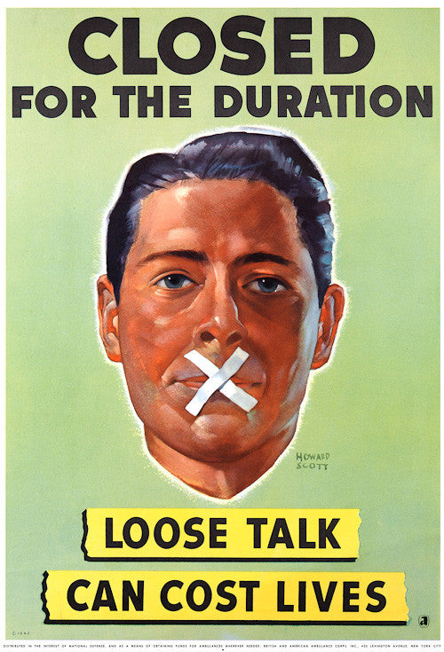 'Closed for the Duration. Loose talk can cost lives.' WWII homefront illustration by Howard Scott, 1942.