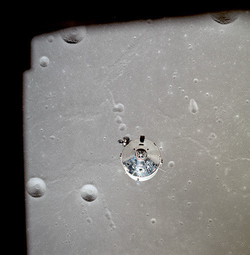 The Apollo 11 Command and Service Module 'Columbia' over the Craters Taruntius K, Taruntius P, and Dorsum Cayeux (in Mare Fecunditatis). Partially visible are craters Anvil and Taruntius H. July 20, 1969. (Source: NASA)