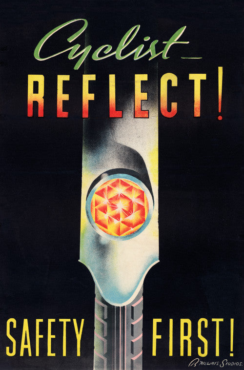 Cyclist - Reflect! Safety first! A reflector is mounted on the rear mudguard of a bicycle wheel. This safety poster was created by the New Zealand Railways Publicity Branch, circa 1930s.