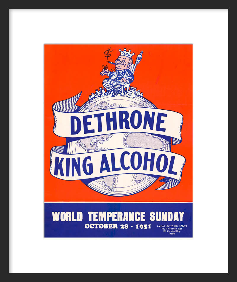 Dethrone King Alcohol. "World Temperance Sunday. Sunday, October 28, 1951." Vintage temperance poster shows a man crowned king surrounded by bags of money while sitting atop the world. From Kansas United Dry Forces, 1951.