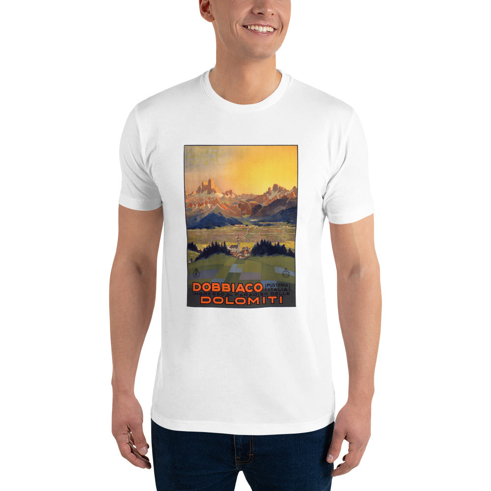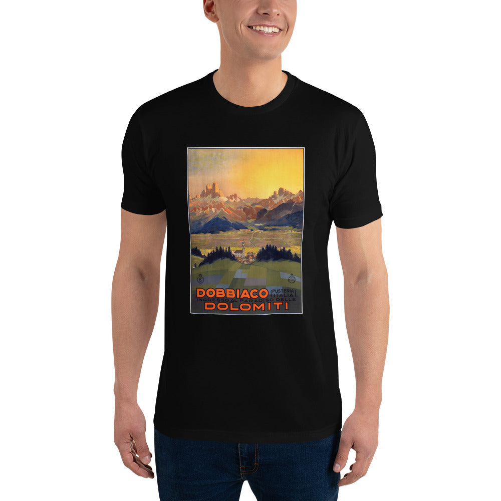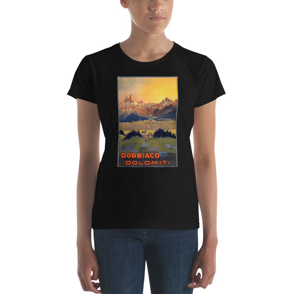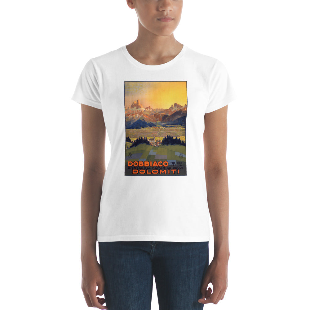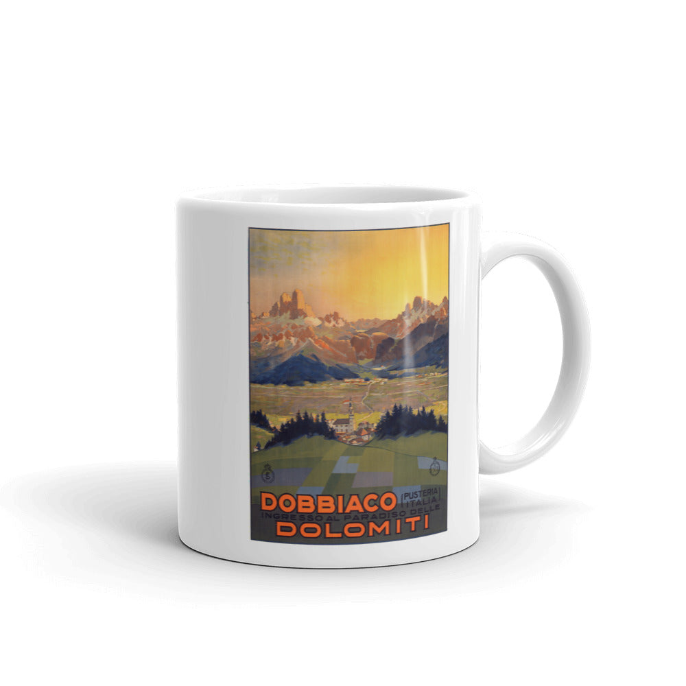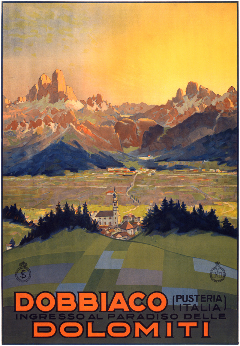 Dobbiaco, Italy travel poster. This vintage travel poster circa 1920 shows the Italian village of Dobbiaco with the Dolomite Alps rising in the distance. "Dobbiaco (pusteria italia) ingresso al paradiso delle Dolomiti."