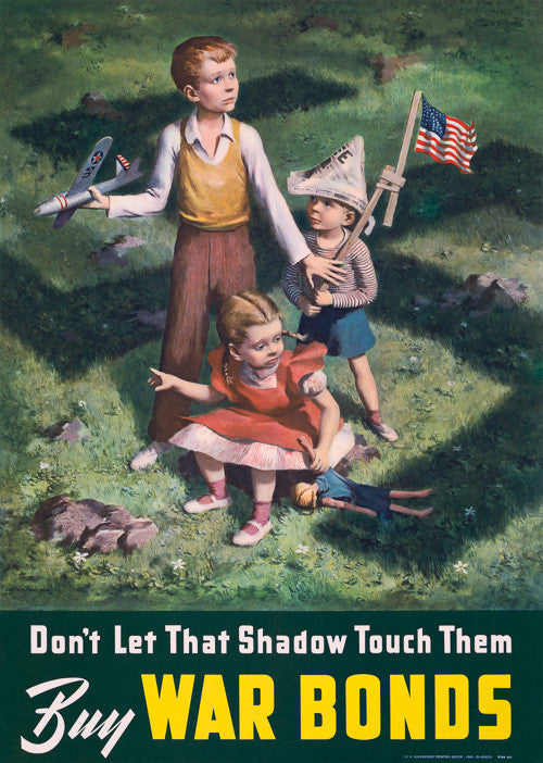 Don't let that shadow touch them. Buy War Bonds. Vintage WWII poster, 1942. Three children, one holding a United States flag, play in the shadow of a giant swastika. Department of the Treasury War Savings poster for War Bonds.
