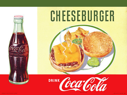 Enjoy a Coca-Cola with your cheeseburger. Scanned from an actual diner counter card from 1958. Coca-Cola and 'Coke' are registered trademarks of the Coca-Cola Company, which is not affiliated with this website and does not endorse, sponsor, support or warranty the sale or use of this artwork.