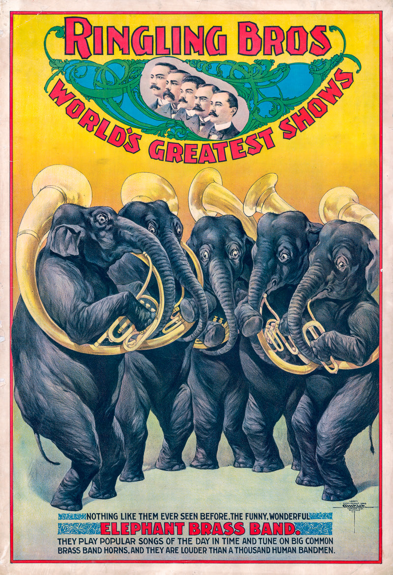 Ringling Bros. World's Greatest Shows Elephant Brass Band. Circus poster, circa 1899. The poster reads: "Nothing like them ever seen before. The funny, wonderful Elephant Brass Band. They play popular songs of the day in time and tune on big common brass band horns, and they are louder than a thousand human bandmen."