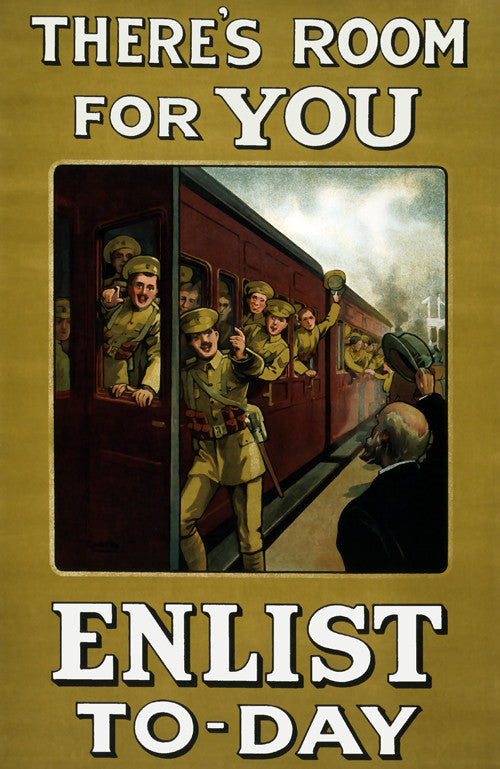 A British World War I recruiting poster showing soldiers boarding a train and gesturing to others to join them. Printed for the Parliamentary Recruiting Committee in 1915 by Wm. Strain & Sons, Ltd., Belfast, and 104 High Holborn, London, W.C.