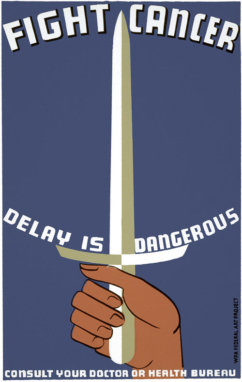 From the New York WPA Federal Art Project between 1936 and 1938, this poster encourages early treatment for cancer: 'Fight Cancer. Delay is dangerous. Consult your doctor or health bureau.'