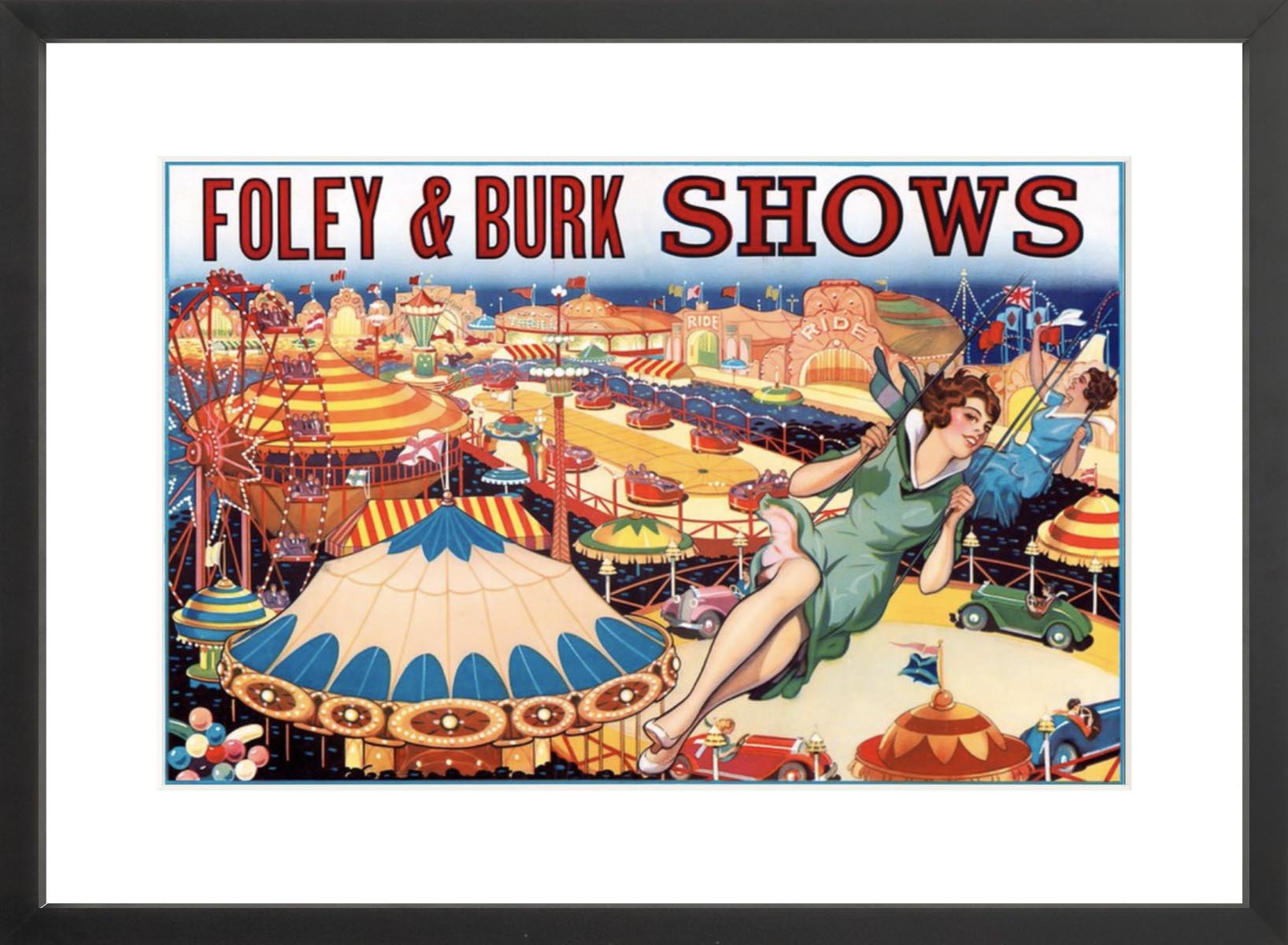 Foley & Burk Shows. This vintage poster for the Foley & Burk Shows circus and carnival shows young women on swings above the midway. Circa 1940s.
