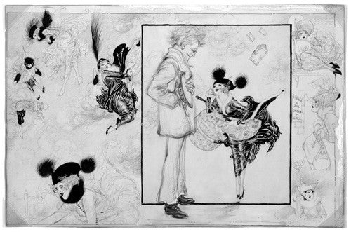 This 1918 WWI poster by popular contemporary artist Nell Brinkley shows a shower of beautiful girls raining down around Uncle Sam to offer their services to work in Washington. On the right side Brinkley has illustrated the problems female war workers faced in the city: One sleeps in a chair, one sleeps on a lamp post and one reads a sign that says: 'Apartments, No Dogs, Children or Girls.' Brinkley's popular drawings featured cute girls with masses of curly hair. She was one of the most widely published illustrators at the turn of the century and she frequently focused on the problems confronting working women.