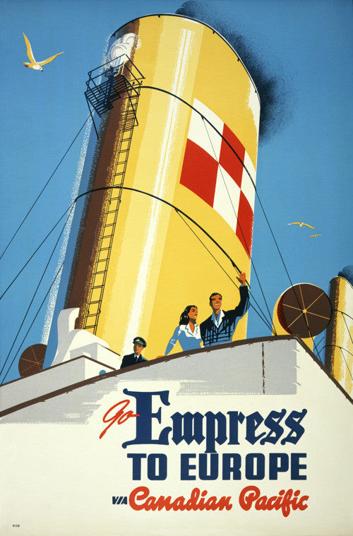 Go Empress to Europe via Canadian Pacific. This vintage travel poster for sea travel to Europe shows passengers and crew on a ship deck. Circa 1950s.