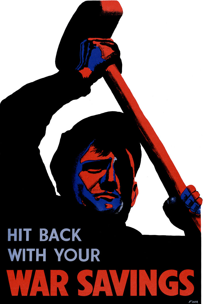 Hit Back With Your War Savings. This WWII poster from Great Britain urges citizens to put their savings to work supporting the war effort. "Issued by the National Savings Committee, London; the Scottish Savings Committee, Edinburgh ; and the Ulster Savings Committee Belfast."