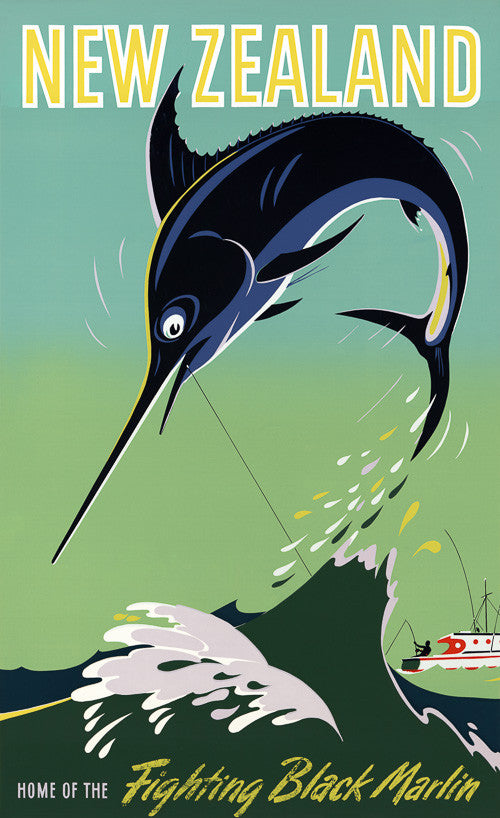 New Zealand. Home of the Fighting Black Marlin. This New Zealand vintage travel poster shows a fisherman on a boat struggling to reel in a black marlin. New Zealand, 1954.