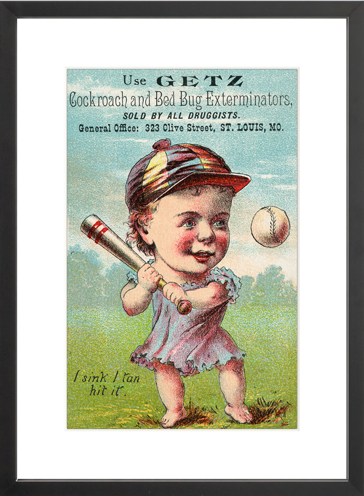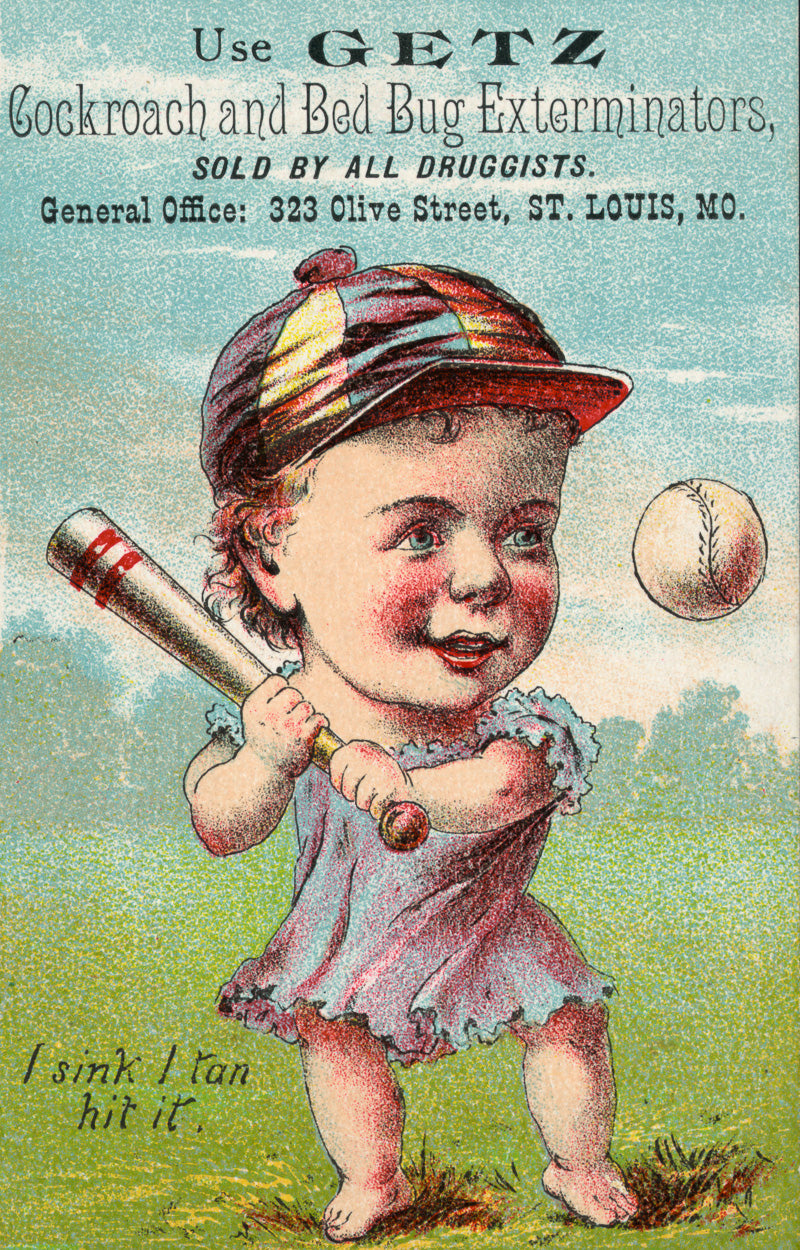 I sink I tan hit it. Use Getz cockroach and bed bug exterminators, sold by all druggists. This advertising trade card shows a child attempting to hit a baseball with a bat. Circa 1807 advertisement for extermination service, St. Louis, MO.