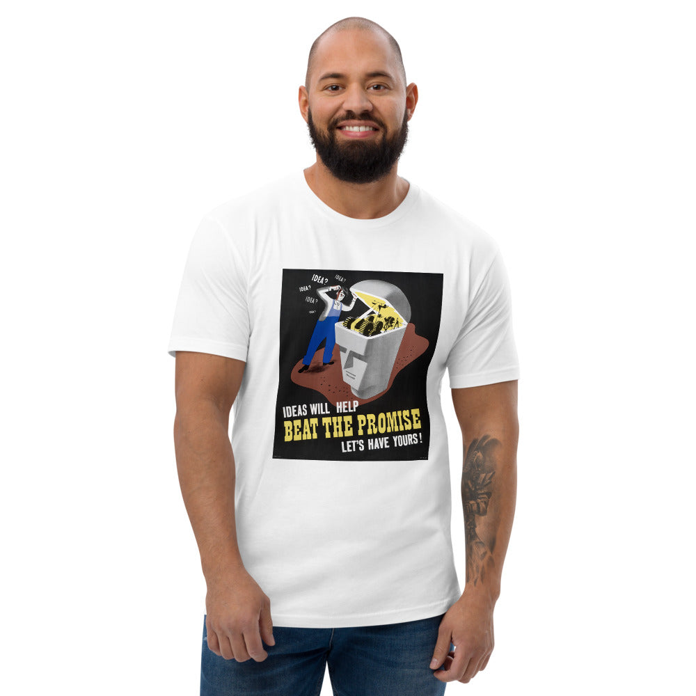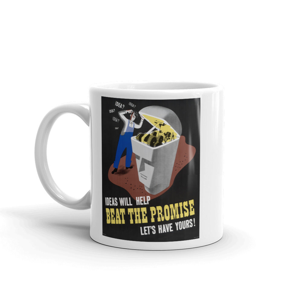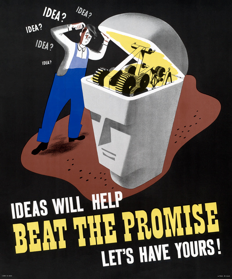 Ideas will help beat the promise. Let's have yours! This WWII era poster shows a man looking inside a mechanical head trying to come up with ideas to make the machine work better. The poster was part of the effort to increase production during the industrial mobilization for WWII.