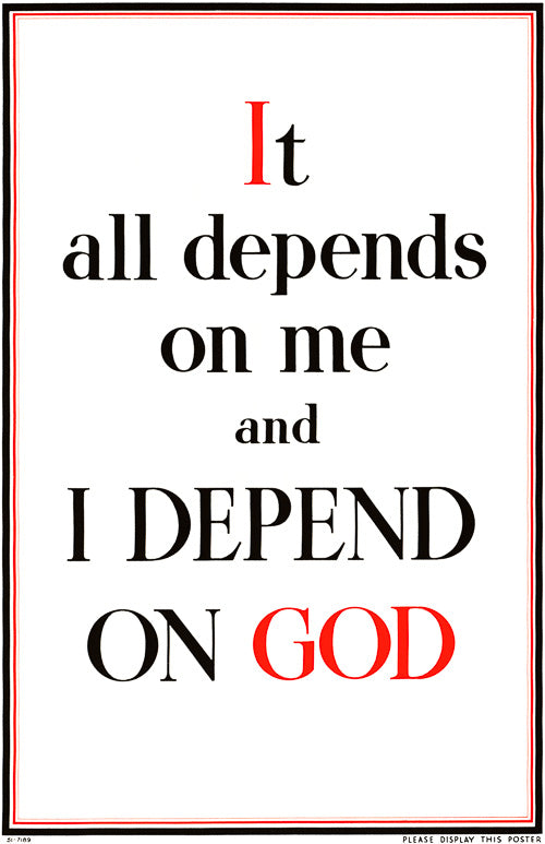 It all depends on me and I depend on God. This reproduction of an original WWII British patriotic propaganda poster also includes the notation at the bottom, "Please display this poster." It all depends on me and I depend on God also serves as a great motivational poster for the workplace, college dorm or home office.