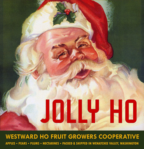 Apples, pears, plums, nectarines, Merry Christmas and a Jolly Ho. Image based on a fruit crate label from Westward Ho Fruit Growers Cooperative, circa 1950.