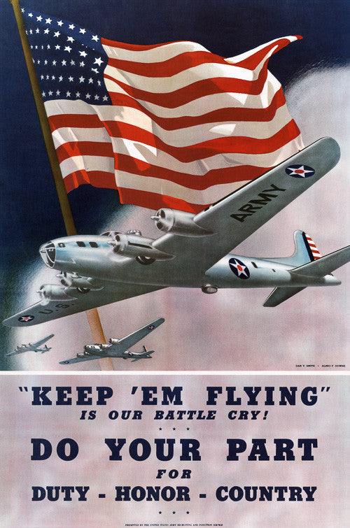 Keep 'em flying is our battle cry! Do your part for duty, honor, country. WWII recruiting and enlistment poster shows U.S. Army planes in flight beneath a United States flag. Circa 1942.