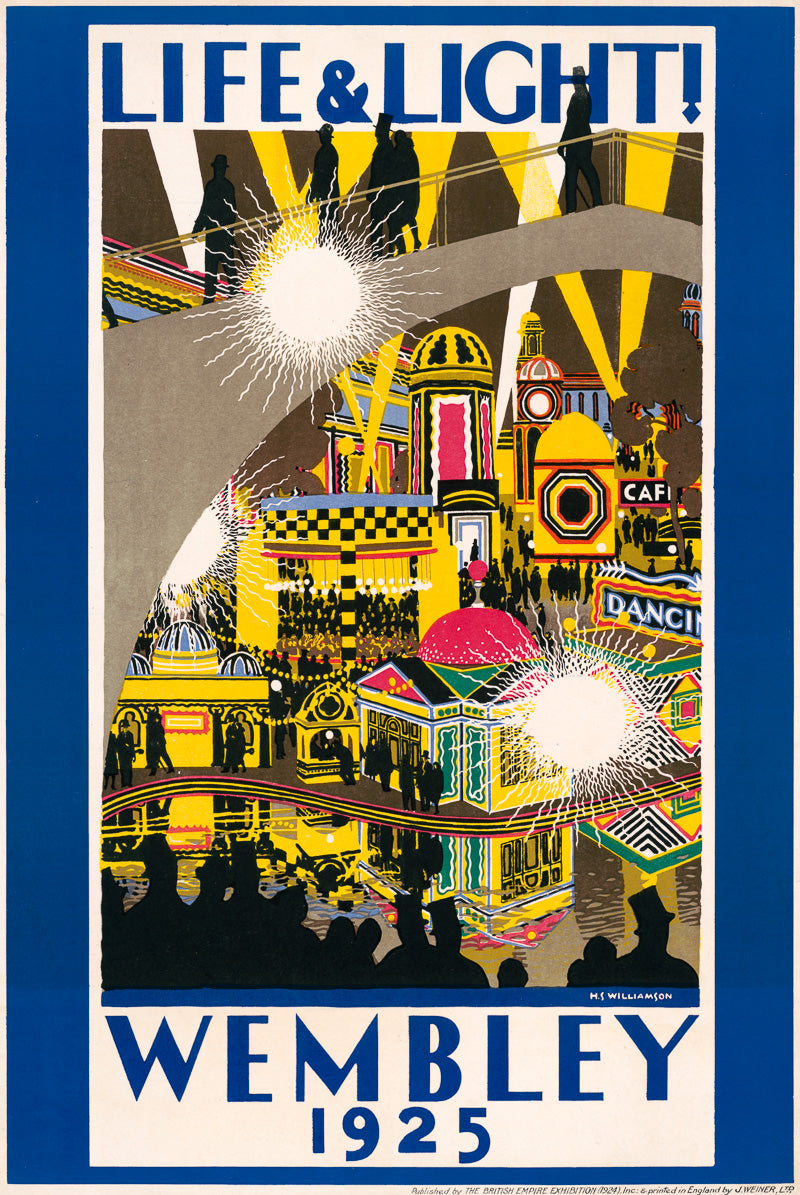 Life & Light! Wembley 1925. A poster for the British Empire Exhibition held at Wembley Park, Wembley, England in 1924 and 1925. The poster shows crowds at pavilions representing various British colonies. Illustrated by Harold Sandys Williamson. Great Britain travel poster, 1925.