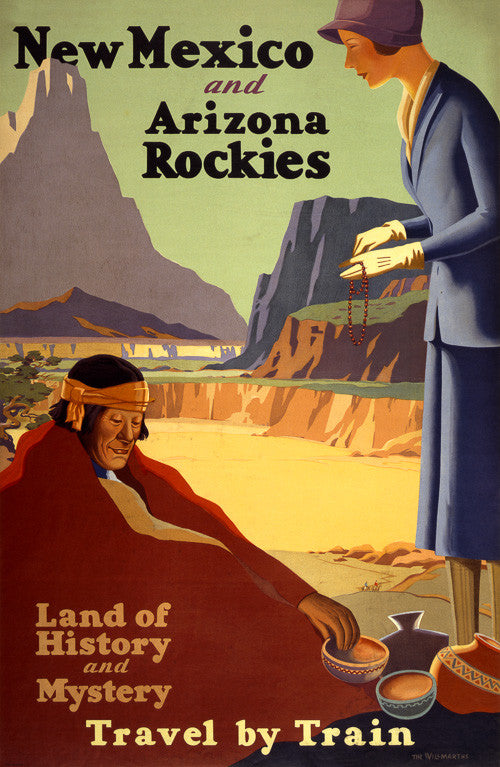 New Mexico and Arizona Rockies. Land of history and mystery. Travel by train. A woman purchase beads and pottery from an Native American man in this vintage travel poster, circa 1925.