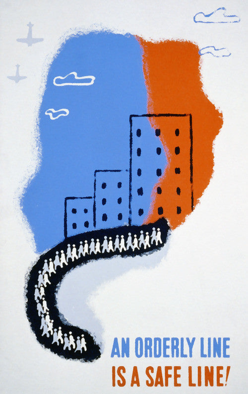 A poster promoting safety and orderly conduct during WWII civil defense air raid drills: 'An orderly line is a safe line!' A Federal Art Project poster by Christopher DeNoon from the New York City Works Progress Administration War Service, between 1941 and 1943.