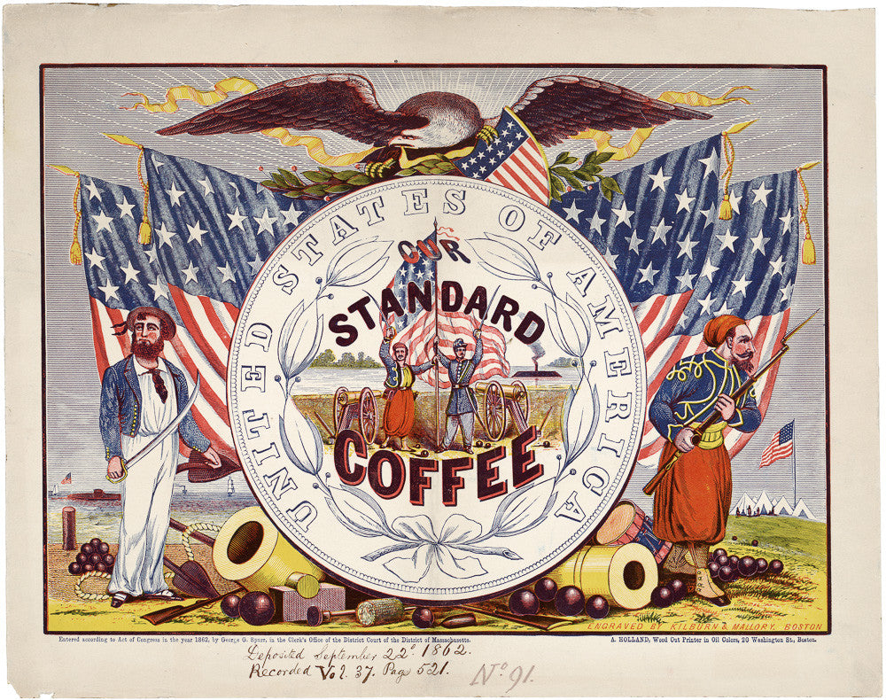 Our Standard Coffee, United States of America. Label for coffee. Wood cut engraving by Kilburn & Mallory of Boston. Printed in color by A. Holland, circa 1862.