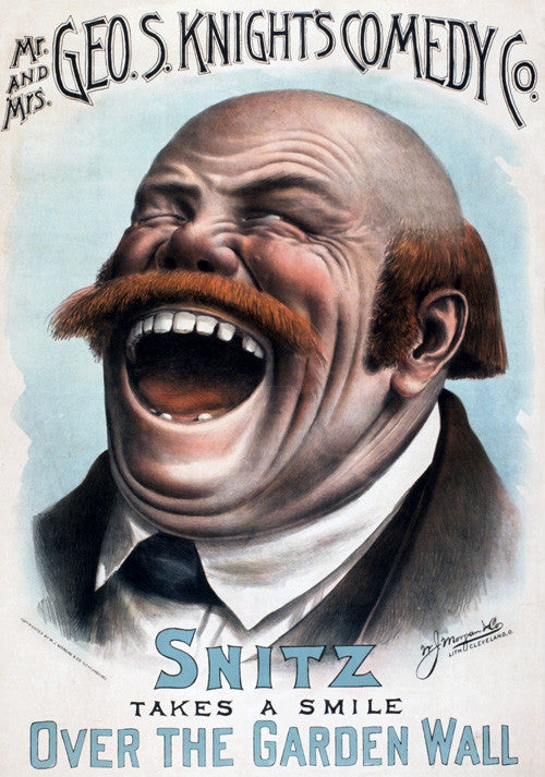 This theater poster was created by the W.J. Morgan & Co. Lithographers of Cincinnatti, Oh, c. 1885. 'Mr. and Mrs. Geo. S. Knight's Comedy Co. Snitz takes a smile over the garden wall.'