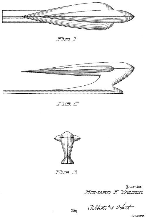 A design patent for a vehicle hood ornament. Designed and filed by Howard F. Yaeger and assigned to the Packard Motor Car Company of Detroit. The patent was issued in 1935.