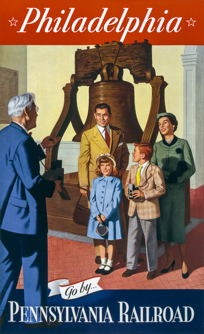 Philadelphia - Go by Pennsylvania Railroad. A family poses in front of the Liberty Bell in Philadelphia in this vintage travel poster for the Pennsylvania Railroad. Circa 1955.