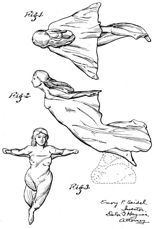 This seductive, ornamental design for a radiator-cap ornament was created by Emory P. Seidel for the Stover Signal Engineering Company of Racine, Wisconsin. The patent was applied for and issued in 1926.