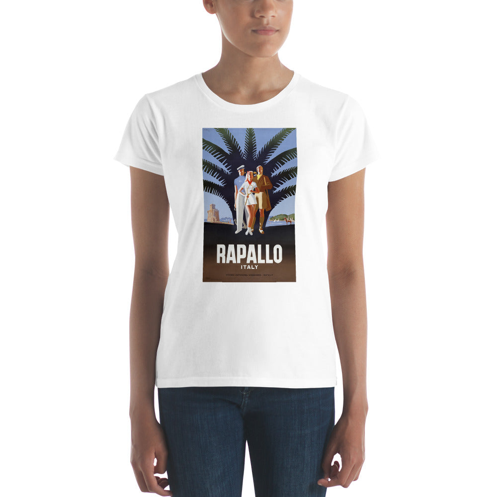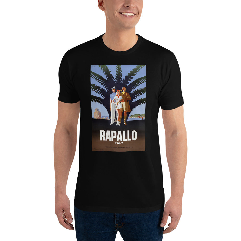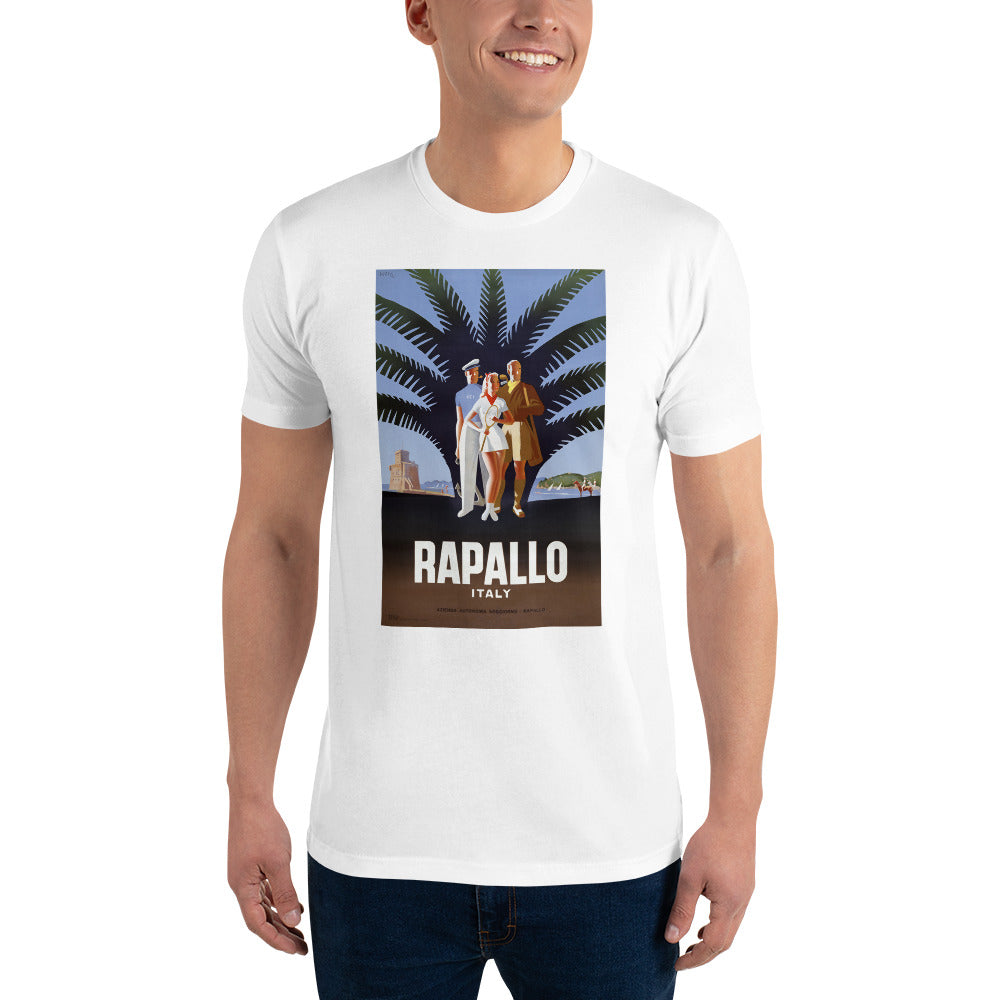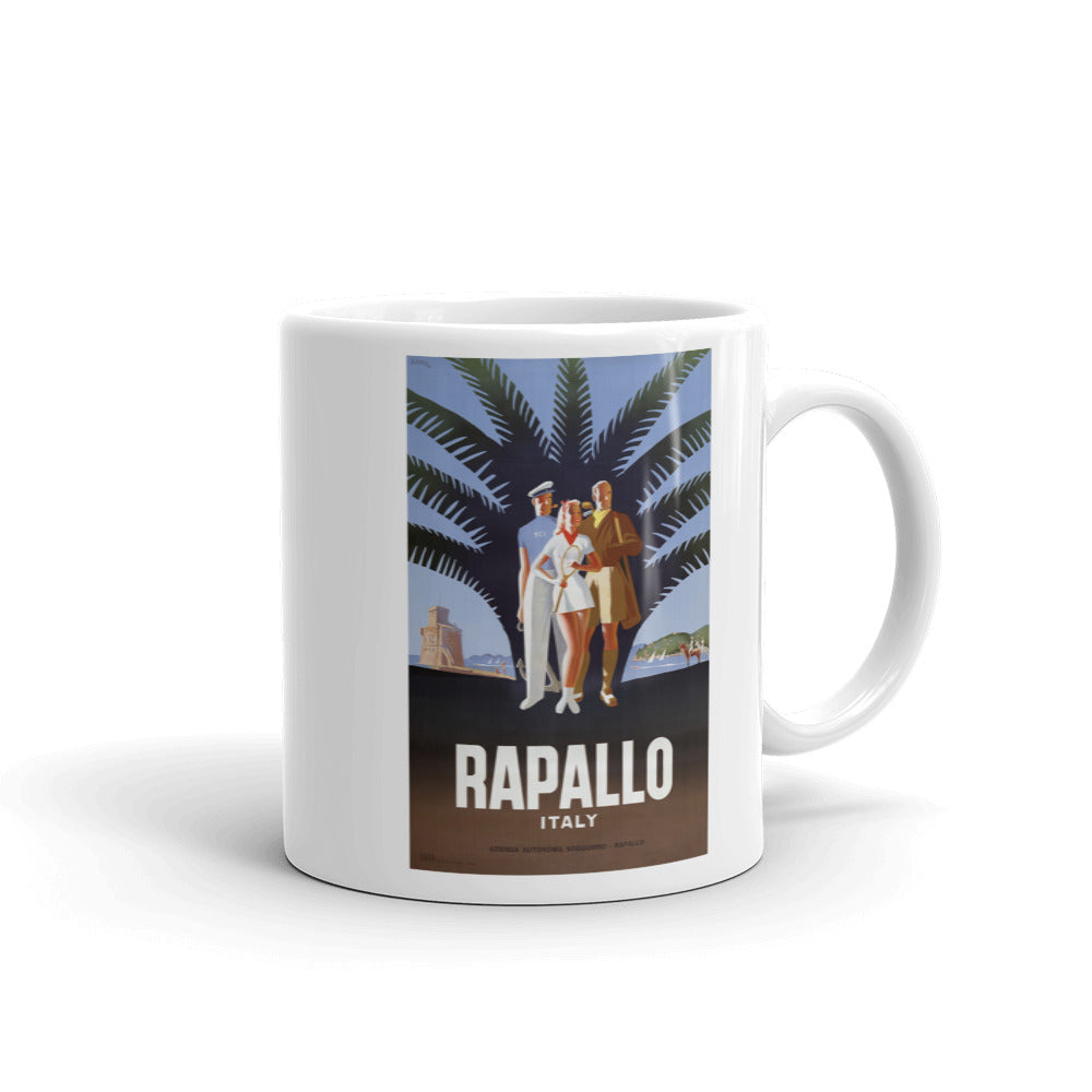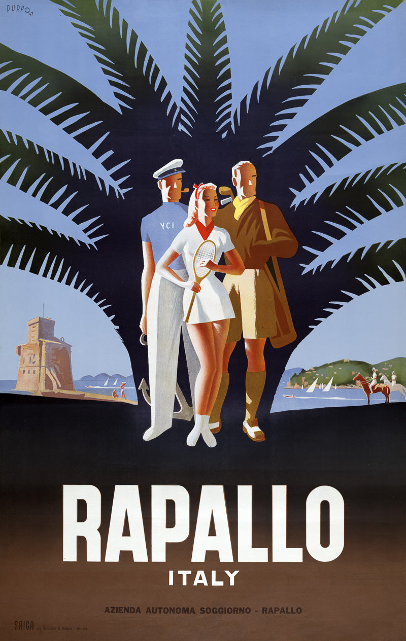 Rapallo, Italy. Circa 1947 vintage travel poster for the Italian Riviera resort town of Rapallo. The poster shows a female tennis player, a male golfer, and a yachtsman standing in front of a palm tree on a beach. "Azienda Autonoma Soggiorno." Illustrated by Mario Puppo.