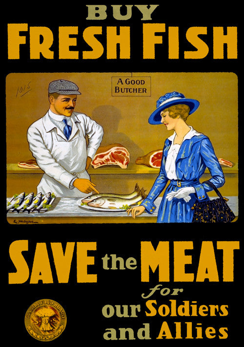 A World War I Canada Food Board poster encouraging shoppers to change their habits so that fresh meat can be shipped to soldiers: 'Buy fresh fish. Save the meat for our soldiers and allies.' Illustrated by E. Henderson, c. 1914.