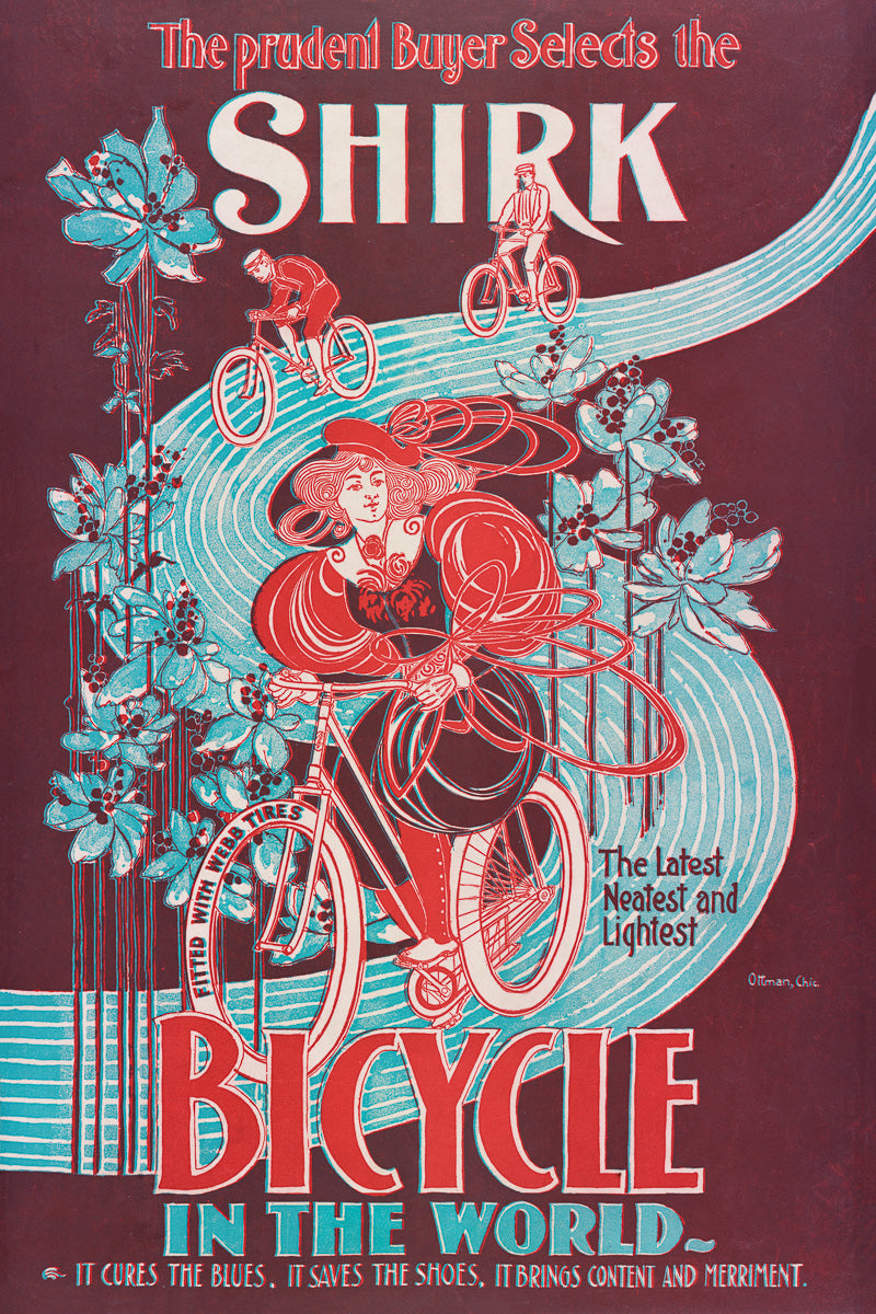 Shirk Bicycle advertisement. "The Prudent buyer selects the Shirk, the latest, neatest and lightest bicycle in the world. It cures the blues, it saves the shoes, it brings content and merriment." This advertisement circa 1890 shows a woman riding a Shirk Bicycle.
