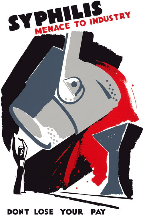 Illustrated in Chicago as part of the Illinois WPA Art Project, this health poster warns about the dangers of contracting Syphilis: 'Syphilis. Menace to Industry. Dont [sic] Lose Your Pay.' Circa 1940.