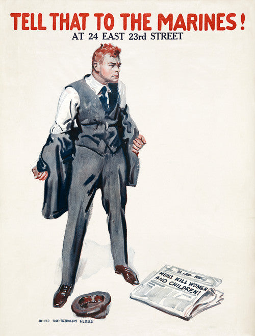 Tell that to the Marines! At 24 E 23rd Street. An angry man takes off his suit jacket in reaction to the newspaper headline "Huns kill women and children!" WWI recruiting poster for the Marines. Illustrated by James Montgomery Flagg, circa 1918.