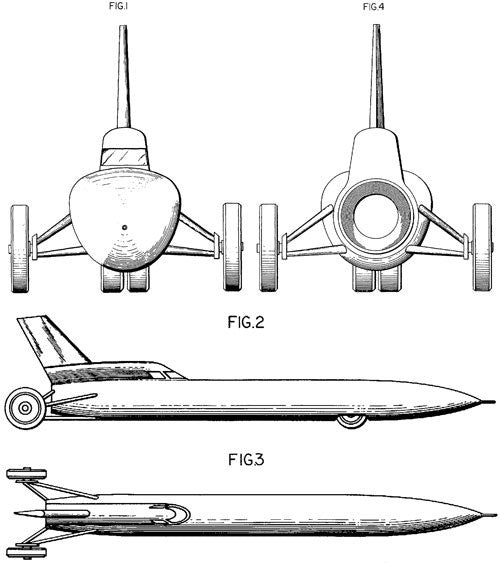 This ornamental patent design for The Blue Flame rocket powered car was issued to The Institute of Gas Technology of Chicago on April 17, 1973. In 1970 The Blue Flame set the world land speed record on the Bonneville Salt Flats in Utah, reaching a speed of 630.388 mph. The record held for 27 years. The Blue Flame was built by Reaction Dynamics, but received technical assistance from The Institute of Gas Technology.